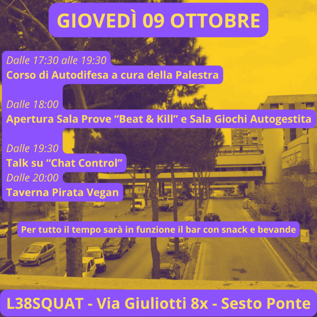 Giovedì 9 Ottobre – Corso di autodifesa, apertura sala giochi autogestita e sala prove “beat & kill”, talk su “chat control” e cena vegan