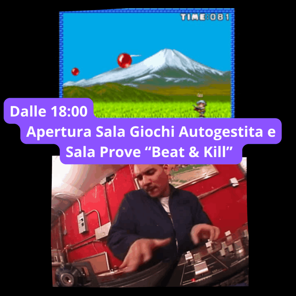Dalle 18:00 Apertura Sala Giochi Autogestita, per il torneo permanente di questo mese vediamo chi mette il record più alto a Pang! ed apertura Sala Prove “Beat & Kill”