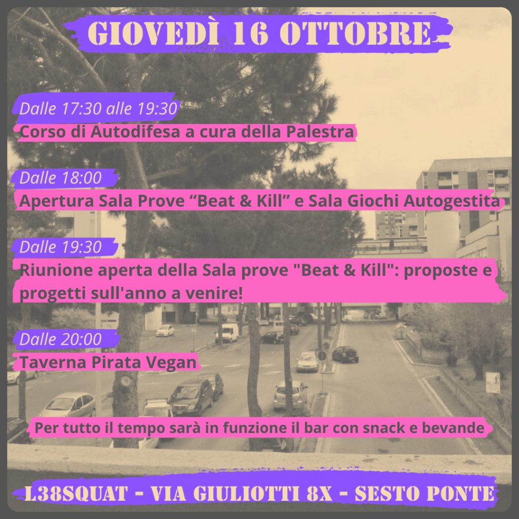 Giovedì 9 Ottobre – Corso di autodifesa, apertura sala giochi autogestita e sala prove “beat & kill”, talk su “chat control” e cena vegan