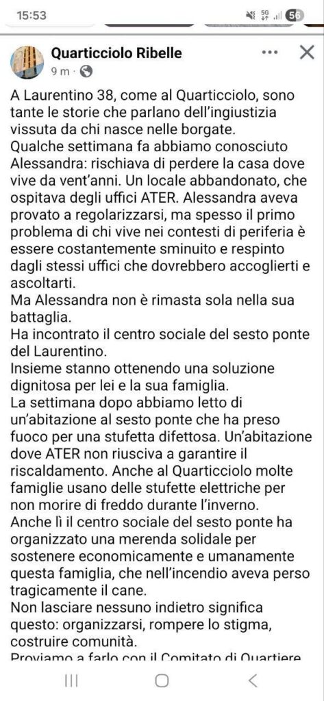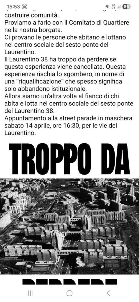 La stessa mattina dello sgombero di ZK Squat, il 29 gennaio, è stato dato un mese di tempo alle compagne e ai compagni del Sesto Ponte del Laurentino 38 per abbandonare un’occupazione abitativa e sociale che resiste da 35 anni, in una delle periferie popolari di Roma.